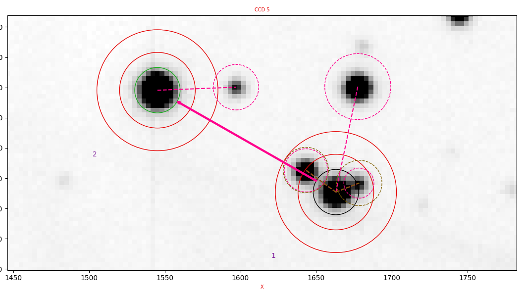 If you do have to use linked apertures, then set them from an average image extracted from the middle of the run. This will reduce the problems caused by refraction. However, if positions change a lot, it can make the start of reduction tricky. If so, then having set the apertures from an image taken near the middle of a run, tweak it using one taken from the start of the run (re-centre each aperture, but leave the linked apertures to follow whatever target they are linked to).