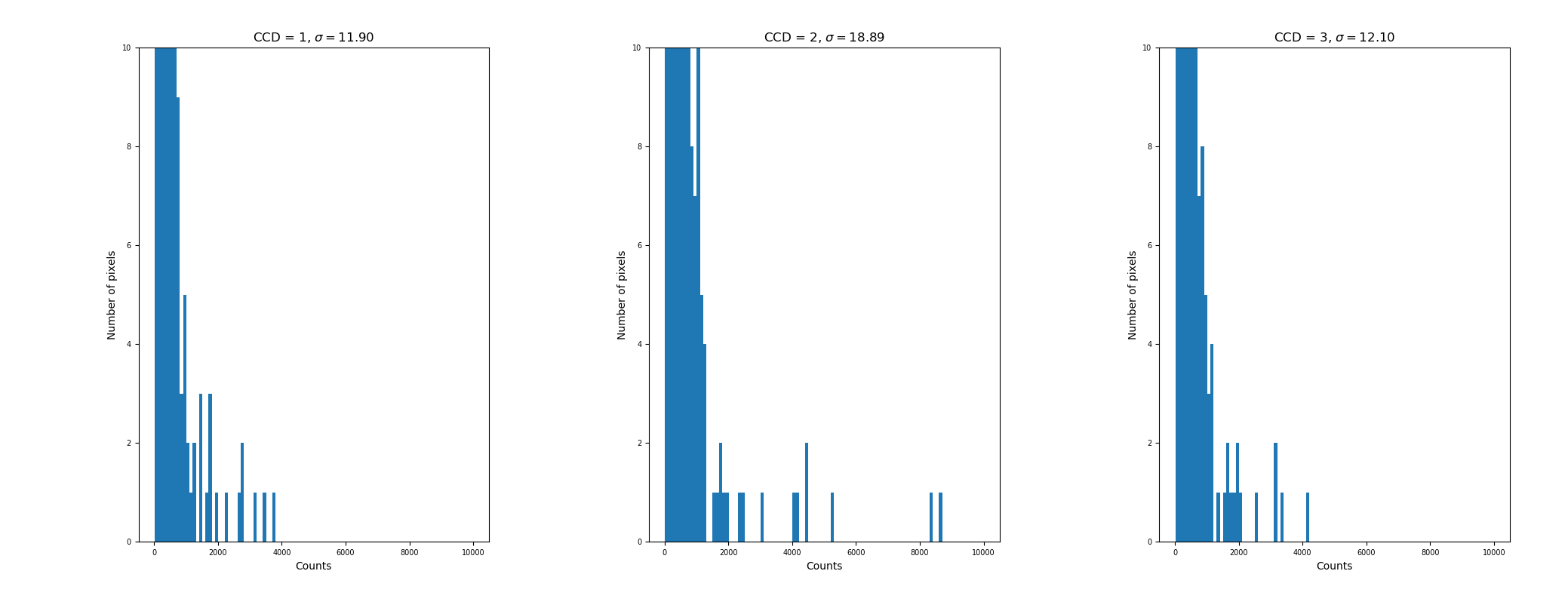 If a CCD is left exposing in complete darkness, counts accumulate through thermal excitation known as “dark current”. Correction for this is particularly important for long exposure images. Both HiPERCAM and ULTRASPEC are kept quite cold and have relatively little dark current, so it is often safe to ignore it. It is also very often not at all easy to take dark calibration frames because of light leakage. At minimum they typically need to be taken at night with the dome closed, so they are a good bad weather calibration. One should normally take a set of biases before and after as well to allow for bias level drift. Dark current is however important for ULTRACAM where the CCDs run relatively warm. In particular there are multiple “hot pixels” with dark currents significantly above the background. Figure Fig. 1 shows histograms of the combination of a series of 60-second darks. 600 on the X-axis corresponds to 10 counts/second, and there are some pixels over 10x higher than this.