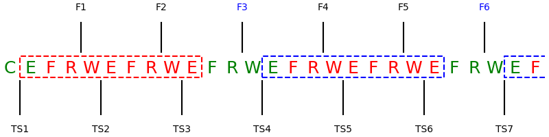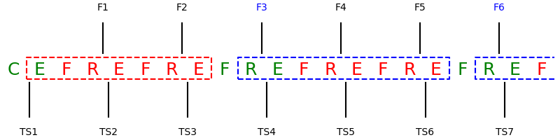Fig. 6 The no-clear mode read sequence. ‘C’ stands for ‘clear’, ‘E’ for the exposure delay, ‘F’ for a frame transfer, ‘R’ for the readout. The dashed boxes show the section during which photons accumulate. The labels at the top show when the respective frames are read, while those along the bottom indicate when timestamps are taken. The timestamps in this case are takn just after the frames are read so that frame 3 carries time stamp 3. The figure assumes that NSKIP=2 applies to the CCD, i.e. 2 out of 3 of the reads actually read junk data because the immediately preceding ‘F’ is a dummy (marked as such by being in red). The first dashed box is marked in red as it is a special case since there is no previous frame readout; all subsequent frames are the same and marked in blue.¶
