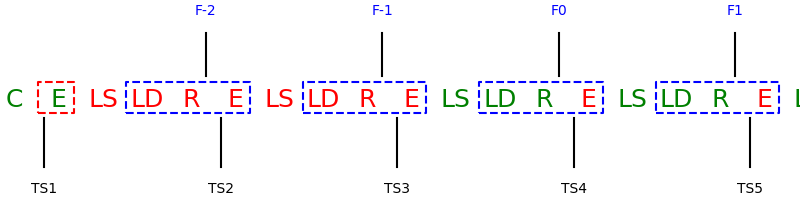 t_1 &= t_S + \text{E} + \text{LS},\\ t_2 &= t_S + 2\text{E} + \text{LS} + \text{LD} + \text{R},